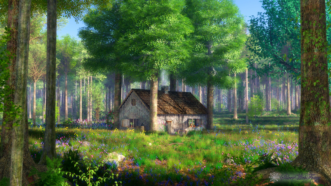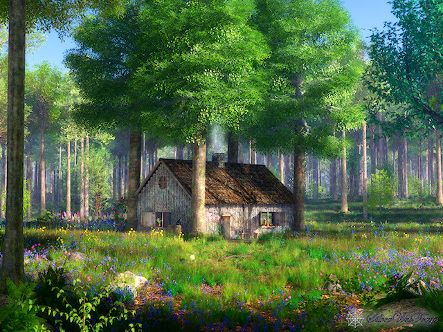 “I fancied I saw a thin blue smoke rising amongst the stems of larger trees in front of me; and soon I came to an open spot of ground in which stood a little cottage, so built that the stems of four great trees formed its corners, while their branches met and intertwined over its roof, heaping a great cloud of leaves over it, up towards the heavens. The cottage, I now saw, was built of the stems of small trees set closely together.…
