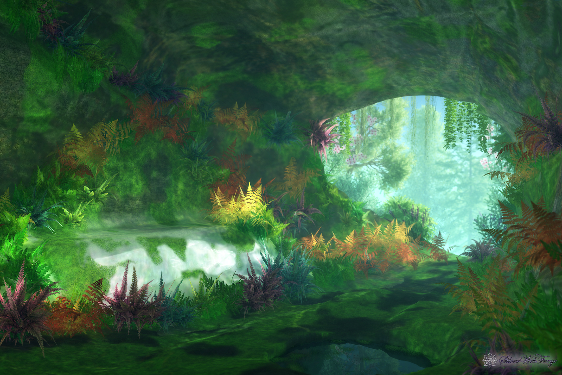 “Just where the path seemed to end, rose a great rock, quite overgrown with shrubs and creeping plants, some of them in full and splendid blossom: these almost concealed an opening in the rock, into which the path appeared to lead. I entered, thirsting for the shade which it promised. What was my delight to find a rocky cell, all the angles rounded away with rich moss, and every ledge and projection crowded with lovely ferns, the variety of whose forms, and groupings, and shades wrought in me like a poem; for such a harmony could not exist, except they all consented to some one end! A little well of the clearest water filled a mossy hollow in one corner. I drank, and felt as if I knew what the elixir of life must be; then threw myself on a mossy mound that lay like a couch along the inner end. Here I lay in a delicious reverie for some time.